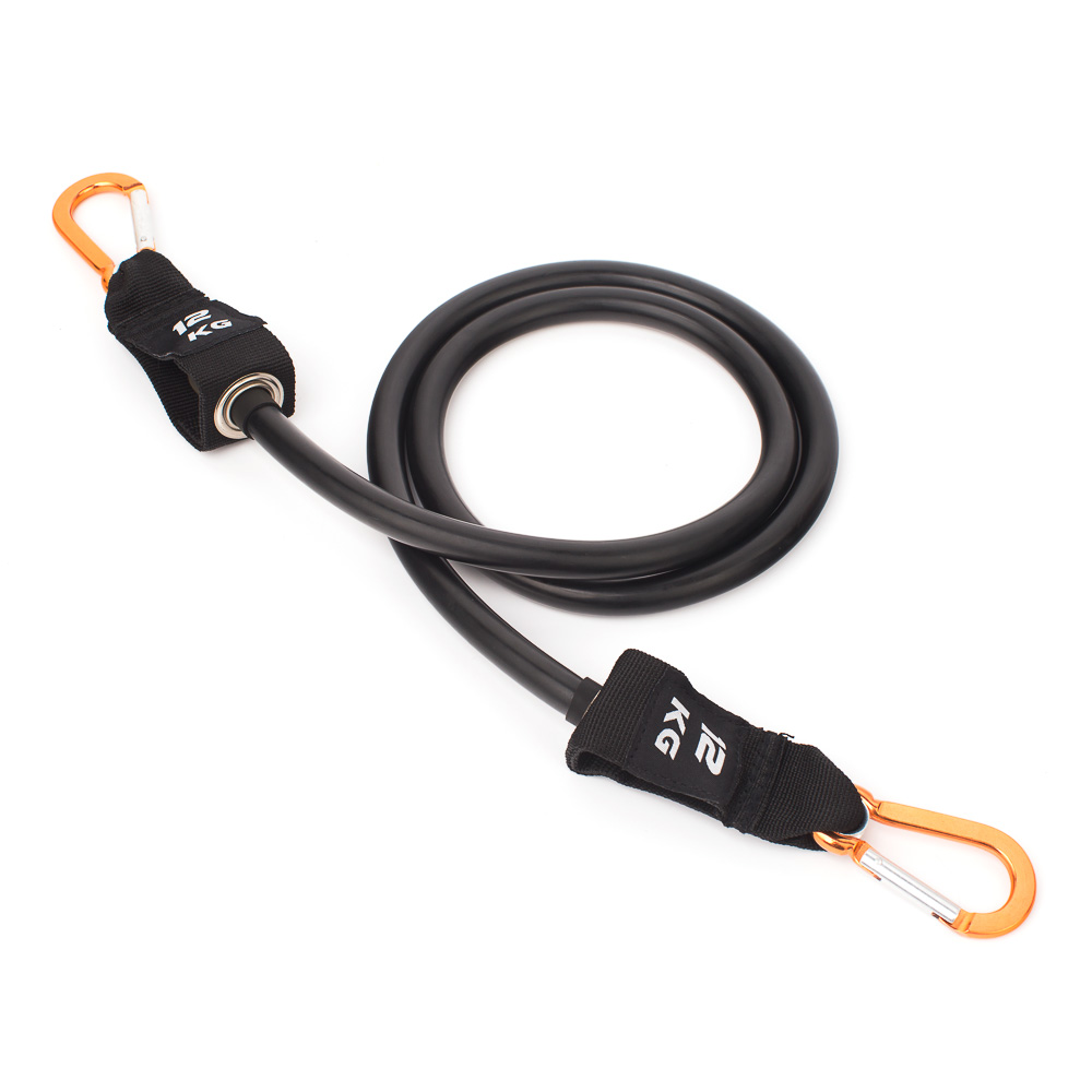 Черная латексная трубка с внутренним противоразрывным кордом и двумя карабинами на концах имеет длину 120 см (с карабинами - 145 см), нагрузка 12 кг. Эспандер может растягивается в три раза от своей первоначальной длины (примерно до 360 - 380 см). К карабинам можно пристегнуть ручки или манжеты для ног.
