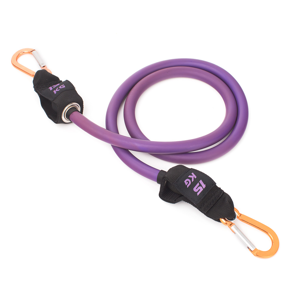 Фиолетовая латексная трубка с внутренним противоразрывным кордом и двумя карабинами на концах имеет длину 120 см (с карабинами - 145 см), нагрузка 15 кг. Эспандер может растягиваться в три раза от своей первоначальной длины (примерно до 360 - 380 см). К карабинам можно пристегнуть ручки или манжеты для ног.