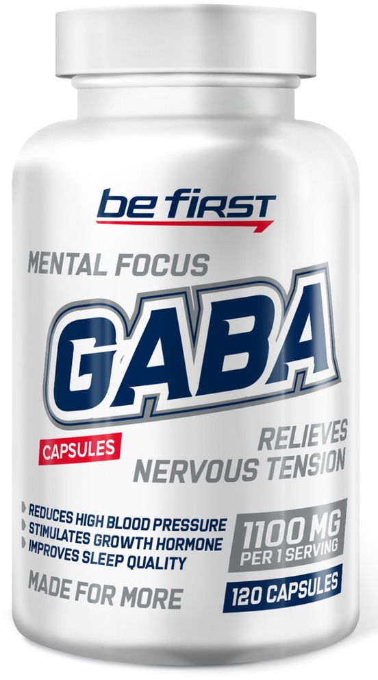В каждой порции Be First GABA Capsules содержится 1100 мг гамма-аминомасляной кислоты. Это аминокислота, воздействующая на центральную нервную систему. Она стимулирует рост мышечной массы и повышает качество сна.