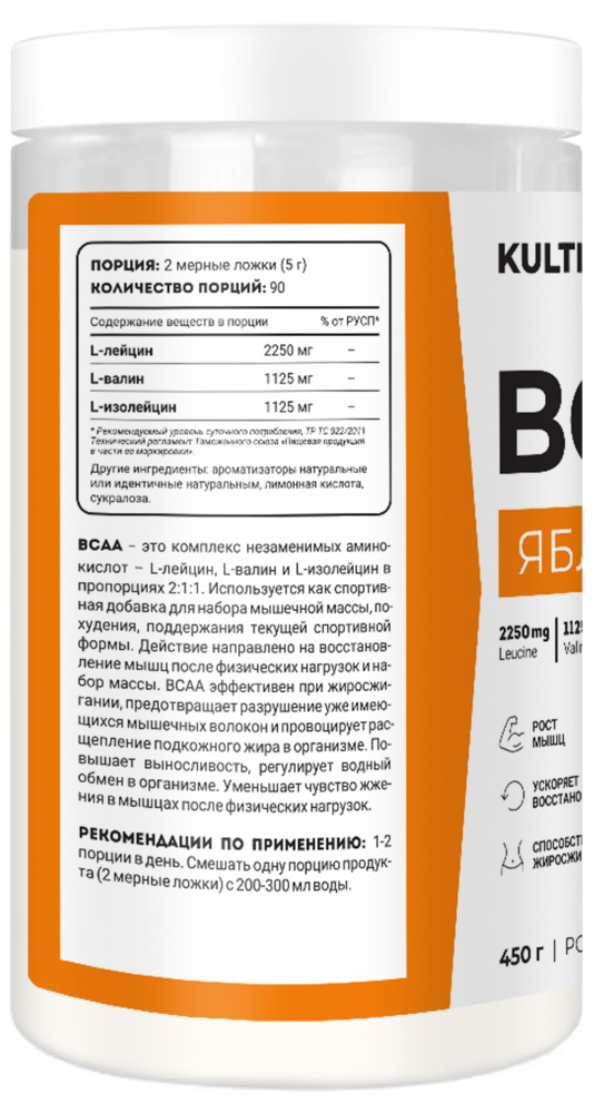 Kultlab BCAA — это комплекс трех незаменимых аминокислот с разветвленной углеродной цепью. L-лейцин, L-изолейцин, L-валин важны для синтеза белка и роста мышц.