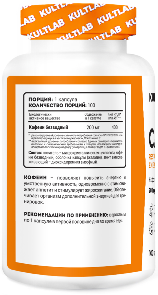 Кофеин от Kultlab - способствует временному повышению умственной активности и бодрости при усталости и сонливости. Одновременно с этим снижает аппетит и стимулирует жиросжигание. Обеспечивает организм дополнительной энергией для тренировок.