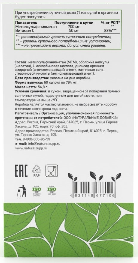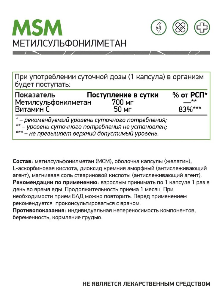 Метилсульфонилметан (МСМ) – органическое серосодержащее соединение. Способствует более быстрому восстановлению суставов и мышц после физической нагрузки, обладает противовоспалительными, антиоксидантными и антиаллергенными свойствами. МСМ участвует в формировании соединительной ткани, способствует заживлению ран, улучшению состояния связок, усилению циркуляции крови.
