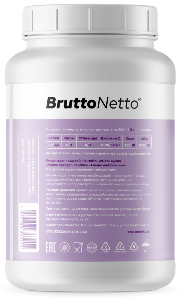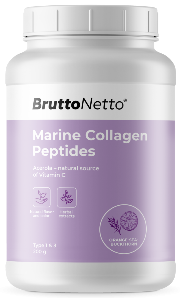 Низкомолекулярный биоактивный гидролизат морского коллагена. Коллаген – это гликопротеин, фибриллярный белок, основной компонент соединительной ткани и самый распространённый белок у млекопитающих, составляющий до 45% белков во всём теле. Необходим для костей, связок, суставов, кожи, ногтей и волос.