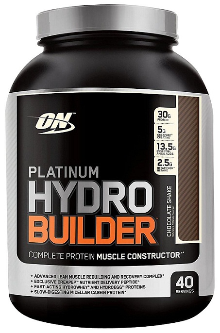 ON Platinum HydroBuilder - белок, который сочетает в себе гидролизат сыворотки, яичного протеина, мицеллярного казеина. Прицип действия ON Platinum HydroBuilder основан на поэтапном усвоении белков- от быстрого гридролизованного изолята сыворотки и гидролизованного яичного белка к замедлению - с использованием мицеллярного казеина. 13,5 гр незаменимых аминокислот, 5 гр креатина Creapure, 2,5 гр бетаина и комплекс ферментов, это именно то, что вам нужно для взрывного мышечного роста.
