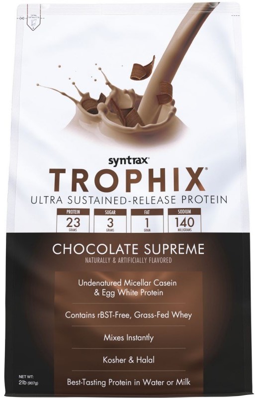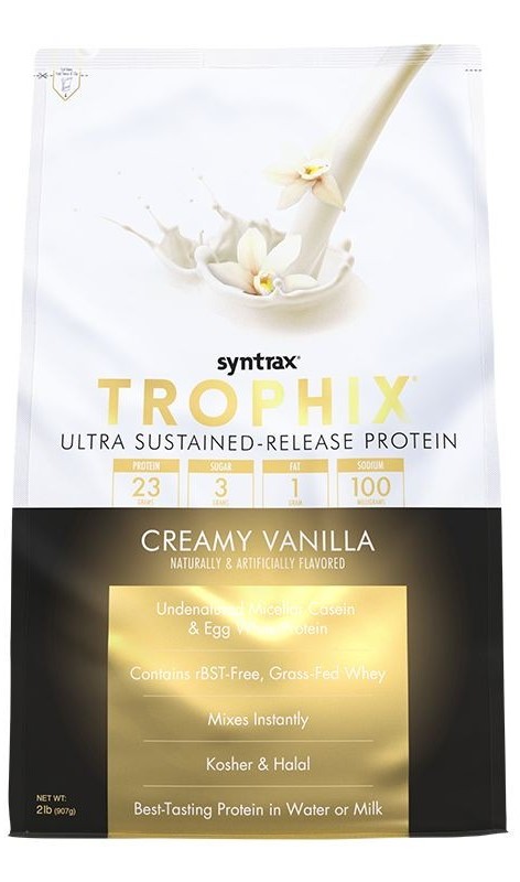 Trophix от компании Syntrax является многокомпонентным протеином. Основу составляет казеин, дополнением к нему выступает сывороточный протеин, яичный альбумин и пептиды глютамина.