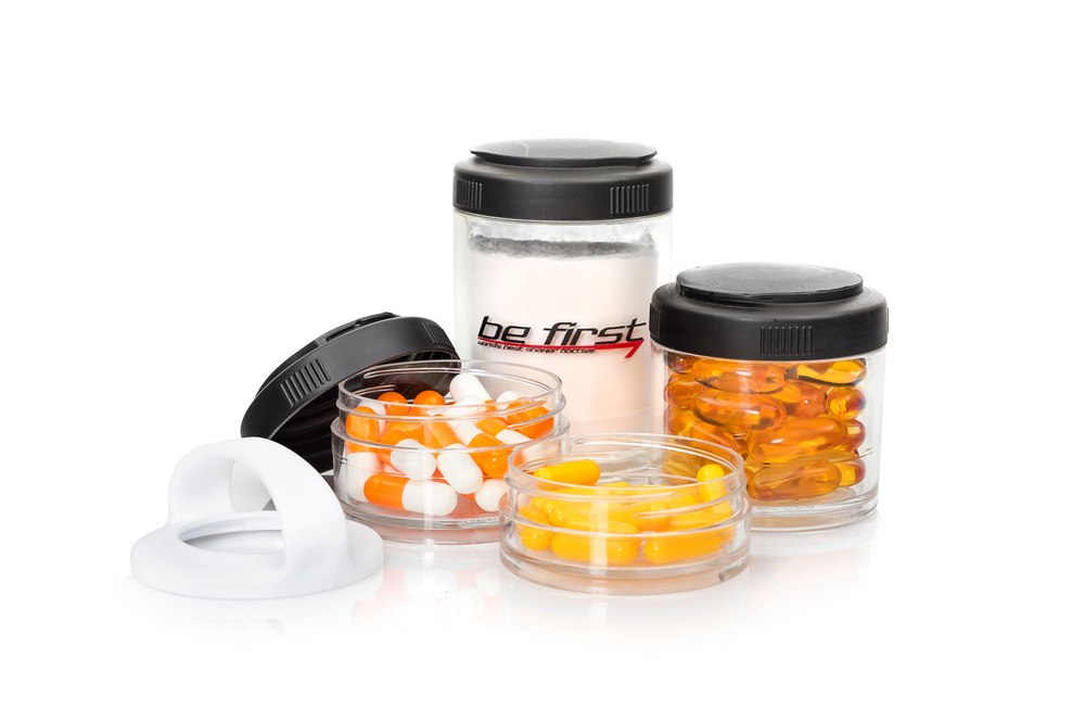 Компания Be First предлагает комплект контейнеров для хранения капсул или порошков. В комплект входит 4 контейнера разной емкости. На завинчивающихся крышках и в донышках сделаны специальные крепления, позволяющие соединять контейнеры между собой в любом порядке. При этом образуется компактный кейс, легко помещающийся в карман сумки или куртки. Можно взять с собой на тренировку только один контейнер, или 2, или 3, или все четыре. К верхнему контейнеру в комплекте можно присоединить ручку, которая делает использование контейнеров еще более удобным.