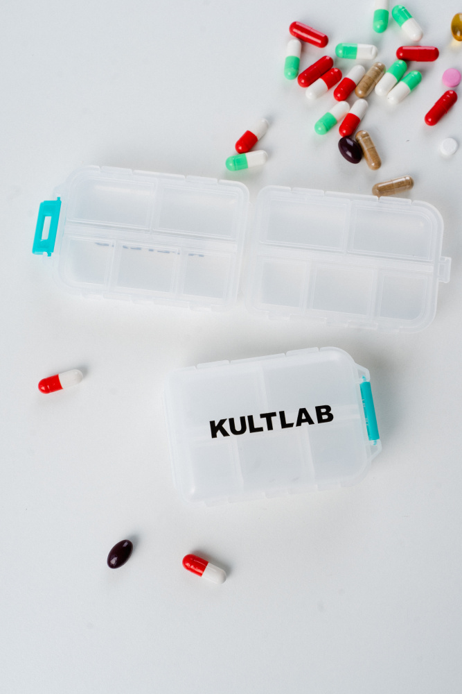 Фирменная таблетница от компании Kultlab предназначена для хранения всевозможных таблеток и капсул.Идеально подходит для аминокислот, креатина, витаминов, а также других таблеток и капсул. Таблетница представляет собой «мини кейс» с отделениями, в которые вы можете компактно разложить необходимые дозировки таблеток и капсул на весь день.