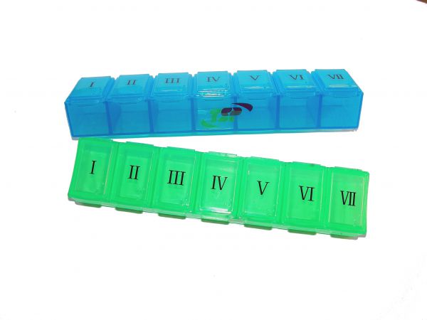 Контейнер с семью отсеками, удобен для хранения капсул и таблеток.