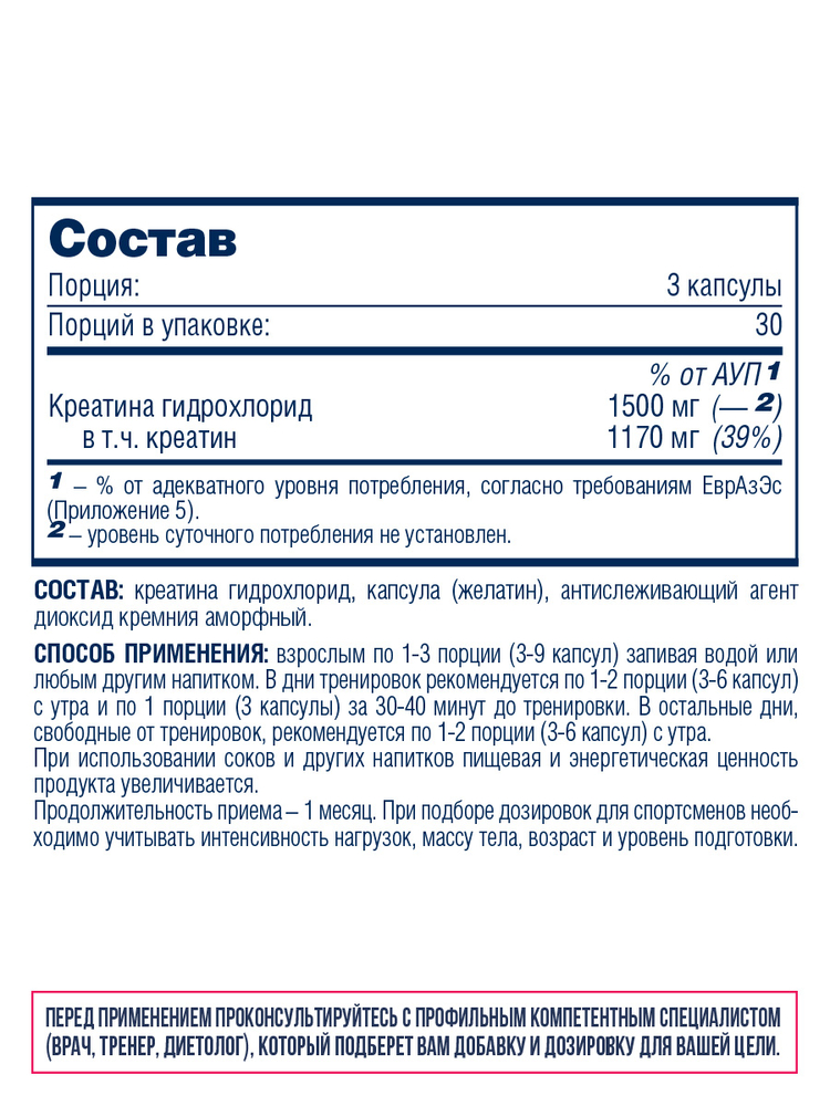 Креатин гидрохлорид в капсулах – добавка для улучшенного снабжения энергией работающих мышц. Спортсменам во время силовых тренировок помогает повысить анаэробную выносливость, увеличить объемность тренинга и быстрее наращивать мышечную массу.