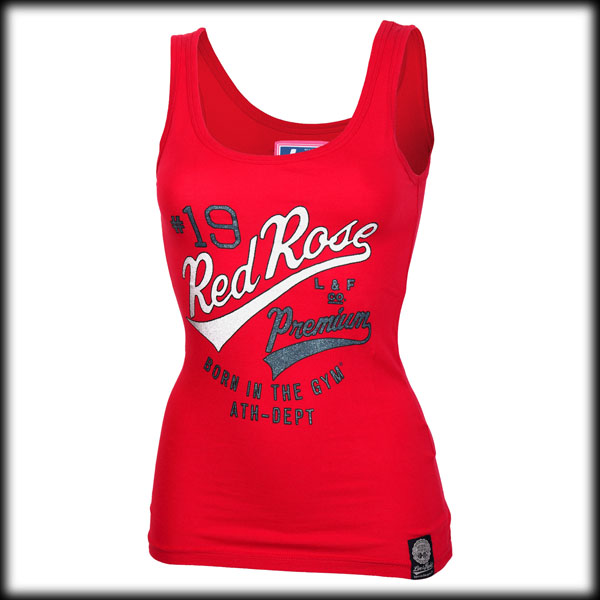 Женская спортивная майка классического кроя из тонкого трикотажа с блестящим принтом на груди и фирменными нашивками.