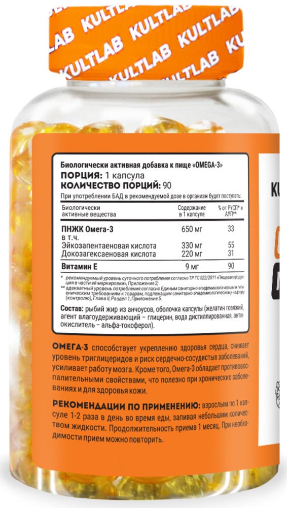 Омега-3 способствует укреплению здоровья сердца, снижает уровень триглицеридов и риск сердечно-сосудистых заболеваний, усиливает работу мозга. Кроме того, Омега-3 обладает противоспалительными свойствами, что полезно при хронических заболеваниях и для здоровья кожи.