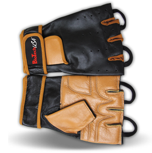 Коричнево-черные перчатки из кожи с фиксаторами.