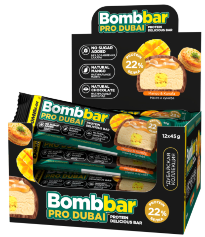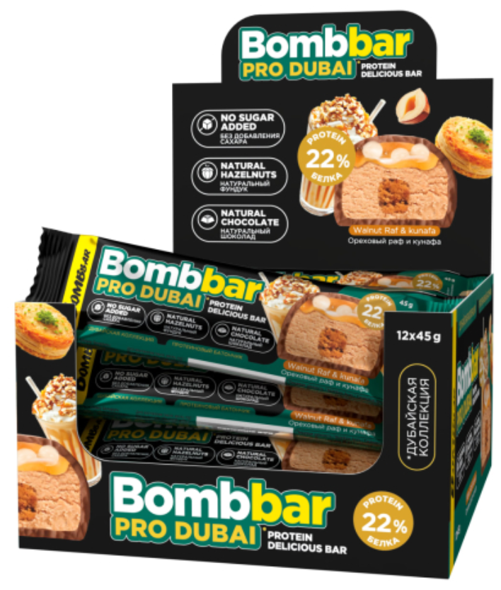 Встречайте новинку - линейка протеиновых батончиков без сахара Bombbar Pro Dubai - три десертных вкуса, вдохновленных легендарным дубайским шоколадом.