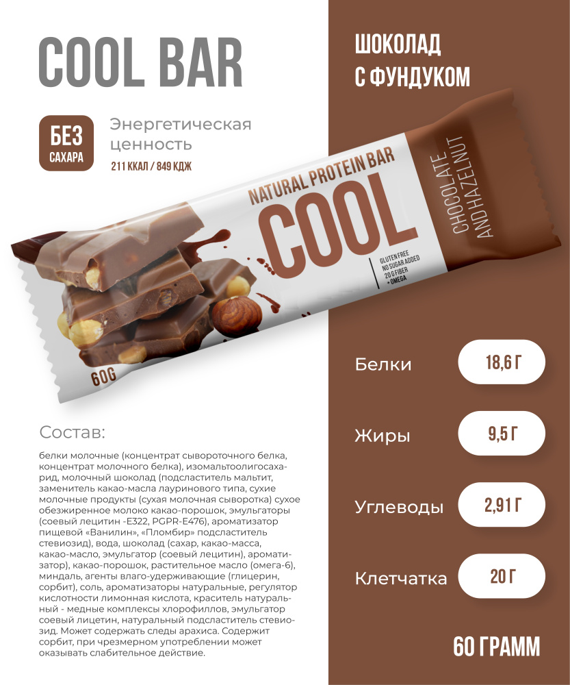 Cool Bar — линейка восхитительно вкусных батончиков из высококачественного сывороточного протеина с добавлением натуральных продуктов: разнообразных ягод и орехов, богатых витаминами, микроэлементами и питательными веществами. Все это густо покрыто плотным слоем шоколадной глазури без сахара.