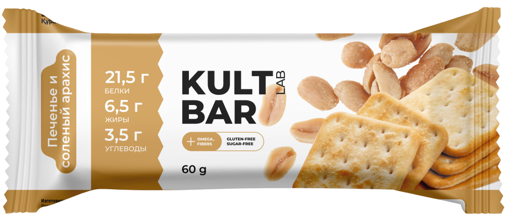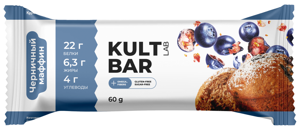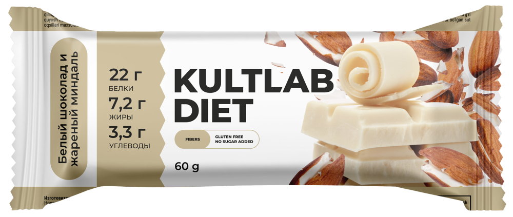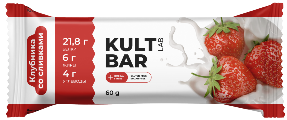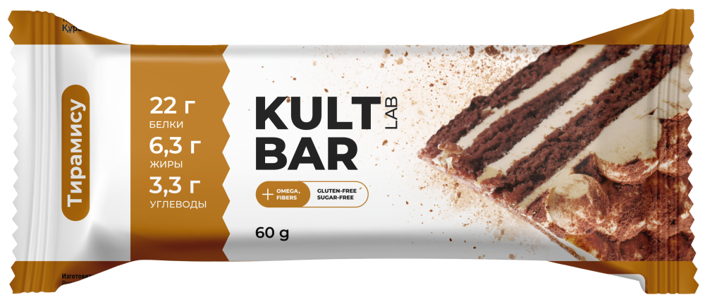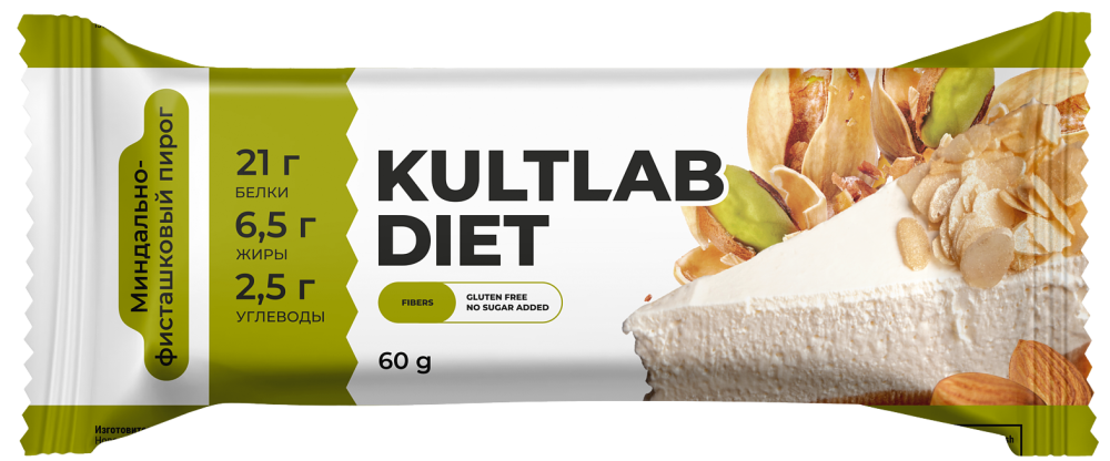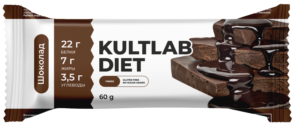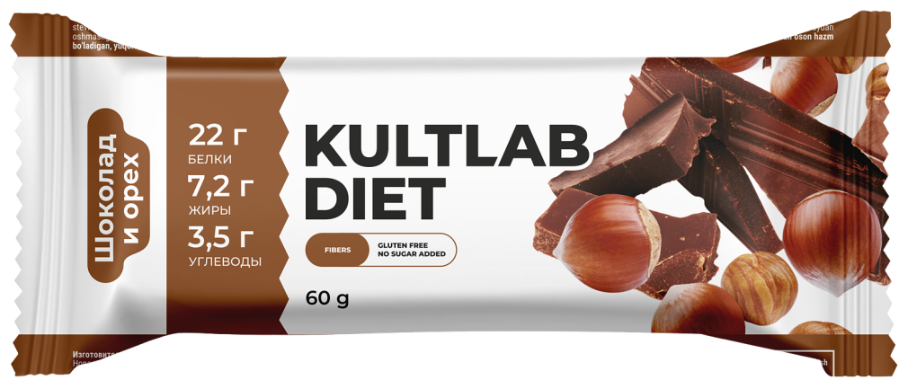Kultlab Kult Diet — питательный фитнес-батончик, состоящий из высококачественного сывороточного протеина и натуральных ингредиентов: ягод, орехов и кусочков шоколада.