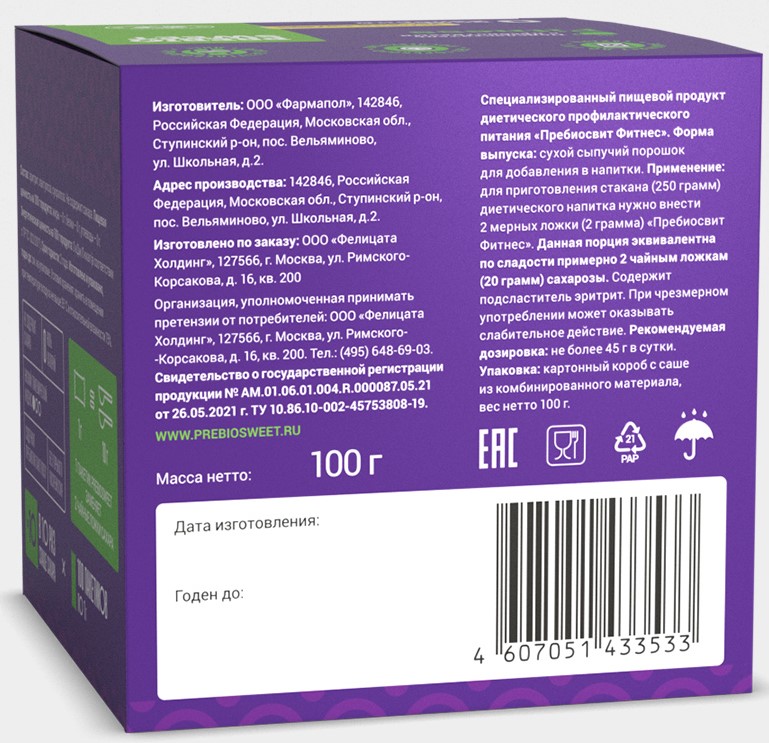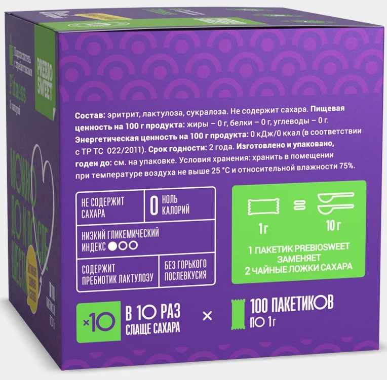 Данная упаковка на 100 стиков Пребиосвит Фитнес заменяет 1 кг сахара. Prebiosweet Fitness незаменим при безуглеводной кето-диете для похудения и ПП, на диабетическом здоровом питании и косметическом голодании, правильном диетическом питании для спортсменов. Имеет чистый вкус сладости, и в нем ноль калорий. Существуют различные виды: стевия, сорбит, ксилит, аллюлоза. Бывает сахзам в таблетках, жидкий и порошок. Но признано, что самым безопасным для здоровья является натуральный подсластитель эритритол или, как его еще называют, дынный сахар эритрол. Не имеет горечи, как стевиозид. 1 мерная ложка заменяет 2 чайные ложки сахара. Сахарозаменитель для диет совершенно безопасен. Заменитель сахара Пребиосвит Фитнес способствует похудению и поддержанию здоровой формы. Продукт для диабетиков не просто относится к категории низкокалорийные продукты, а содержит 0 калорий. Используется как сахарозаменитель для выпечки, подсластитель для напитков и десертов, добавки в кофе и чай, сладости без сахара. Можно добавлять в продукты правильного питания. Термостабилен. Любая еда для похудения с ним становится более здоровой и полезной. В составе Пребиосвит Фитнесс содержится эритрит, сукралоза и 10% лактулозы, известной во всем мире как пребиотик №1. Лактулоза стимулирует рост и жизнедеятельность полезной микрофлоры кишечника.