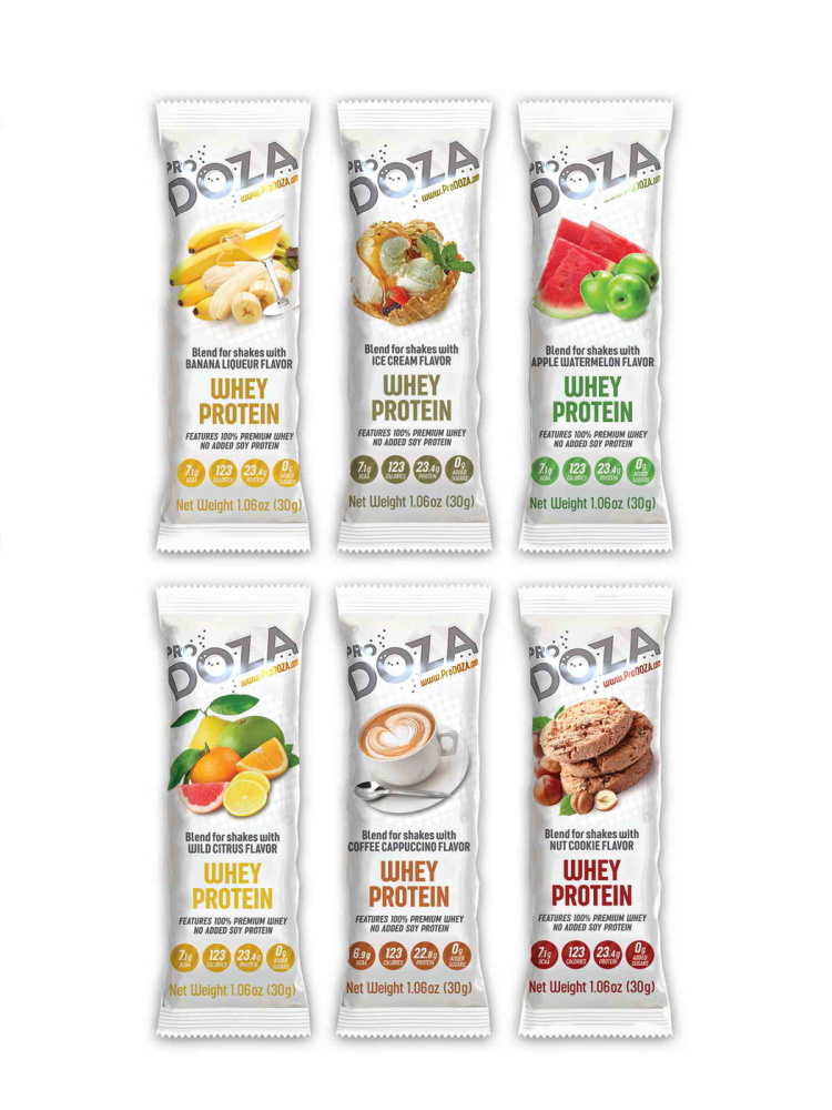Белковый коктейль ProDOZA. Мини-набор из 6-ти разных порционных пакетиков высококачественного сывороточного протеина из европейского сырья. Вкусы: капучино, банановый ликер, дикий цитрус, яблоко-арбуз, ореховое печенье, пломбир. Обладает высокой биологической ценностью. Этот белковый коктейль отлично подходит и для похудения, и для набора мышечной массы. Позволяет быстро восстановить мышцы после тренировки, стимулирует их рост, замедляет процессы катаболизма.