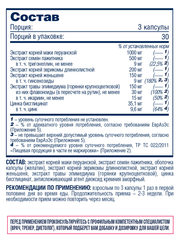 Размер одной порции : Принимайте 1 порцию (3 капсулы) в первой половине дня за 15-30 минут до приема пища. Из-за наличия в продукте адаптогенов с тонизирующим эффектом (эврикомы и женьшеня) начинайте прием с двух капсул натощак перед завтраком. В течение нескольких дней можно довести прием капсул до 3-4 за один прием. Физически активным мужчинам с весом более 90 кг оптимальной дозировкой может быть 5 капсул в день, которые следует разделить на 2 приема: 3 капсулы перед завтраком и 2 перед обедом.