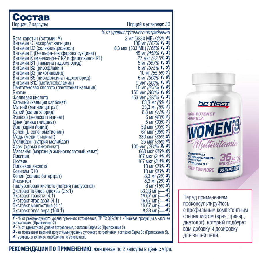 Витаминный комплекс для женщин помогает решить часто встречающуюся ситуацию, когда большие нагрузки (и в частности, спортивные тренировки) вызывают повышенный расход запасов витаминов и микроэлементов организма, а соблюдение диеты (или иные индивидуальные условия) не позволяет получить достаточное количество витаминов и микроэлементов из пищи.