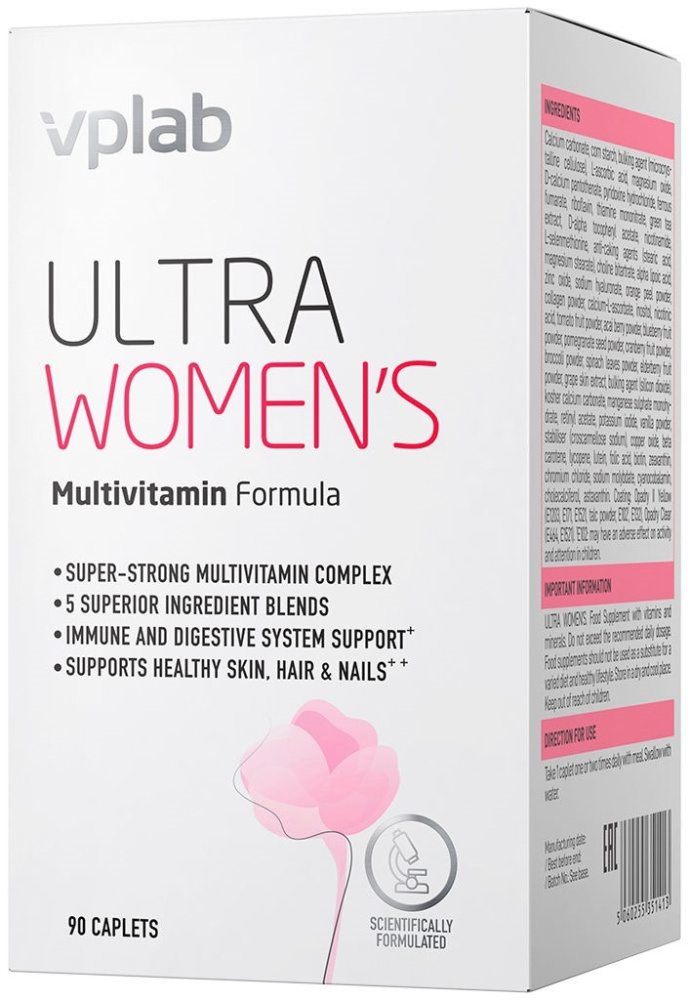Vplab Ultra Womens – это комплекс микронутриентов для активных женщин, формула которого разработана с учетом уникальных особенностей физиологии женского организма. Включающая только проверенные и качественные ингредиенты формула Ultra Womens направлена на поддержание женского здоровья, в том числе на нормализацию энергетического обмена и функций нервной системы, а также здоровья волос, кожи, ногтей и соединительных тканей.