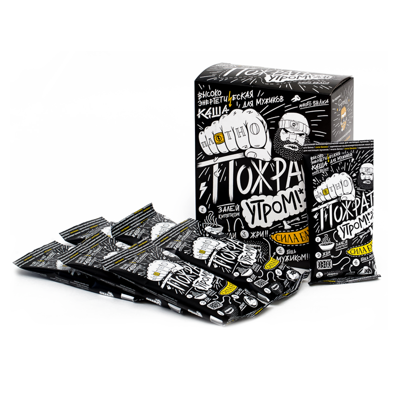 Энергии много не бывает! Каша для мужиков «Пожрать утром» не только насытит тебя как минимум до обеда, но и внесет разнообразие в каждое утро. Хочется экзотики? Начни день с «Силой банана». Соскучился по любимым с детства десертам? Наслаждайся «Дабл шоколадом» и «Ягодным миксом»!