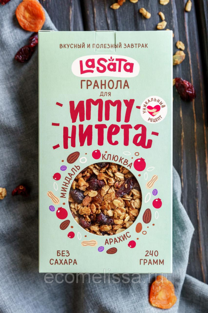 Хрустящая гранола с миндалем, арахисом, вяленой клюквой, изюмом, корицей и мёдом. Звездный вкус для самых-самых!