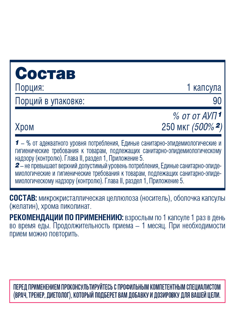 Размер одной порции : Прием добавки обычно практикуется 1-2 раза в сутки вместе с едой, ввиду ее влияния на обмен углеводов. Эффективная дозировка составляет 200-400 мкг в сутки, в этих количествах добавки хрома не вызывают побочных эффектов. [12-13] Согласно инструкции пиколинат хрома (chromium picolinate) принимают в течение 1-3 месяцев.