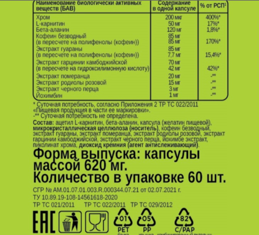 Экстракт родиолы розовой: Экстракт родиолы розовой имеет адаптогенные свойства, которые могут помочь снизить стресс и усталость. Это может быть полезно для тех, кто занимается интенсивными физическими тренировками, так как стресс и недосыпание могут сказаться на процессах жиросжигания.